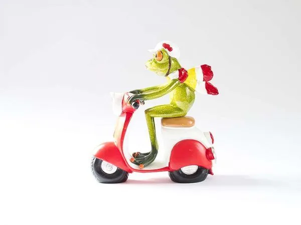 Beeldje van een Oetel op een rode scooter. De kikkers zijn gemaakt van kunststeen. Leuk om cadeau te geven of natuurlijk zelf te houden.